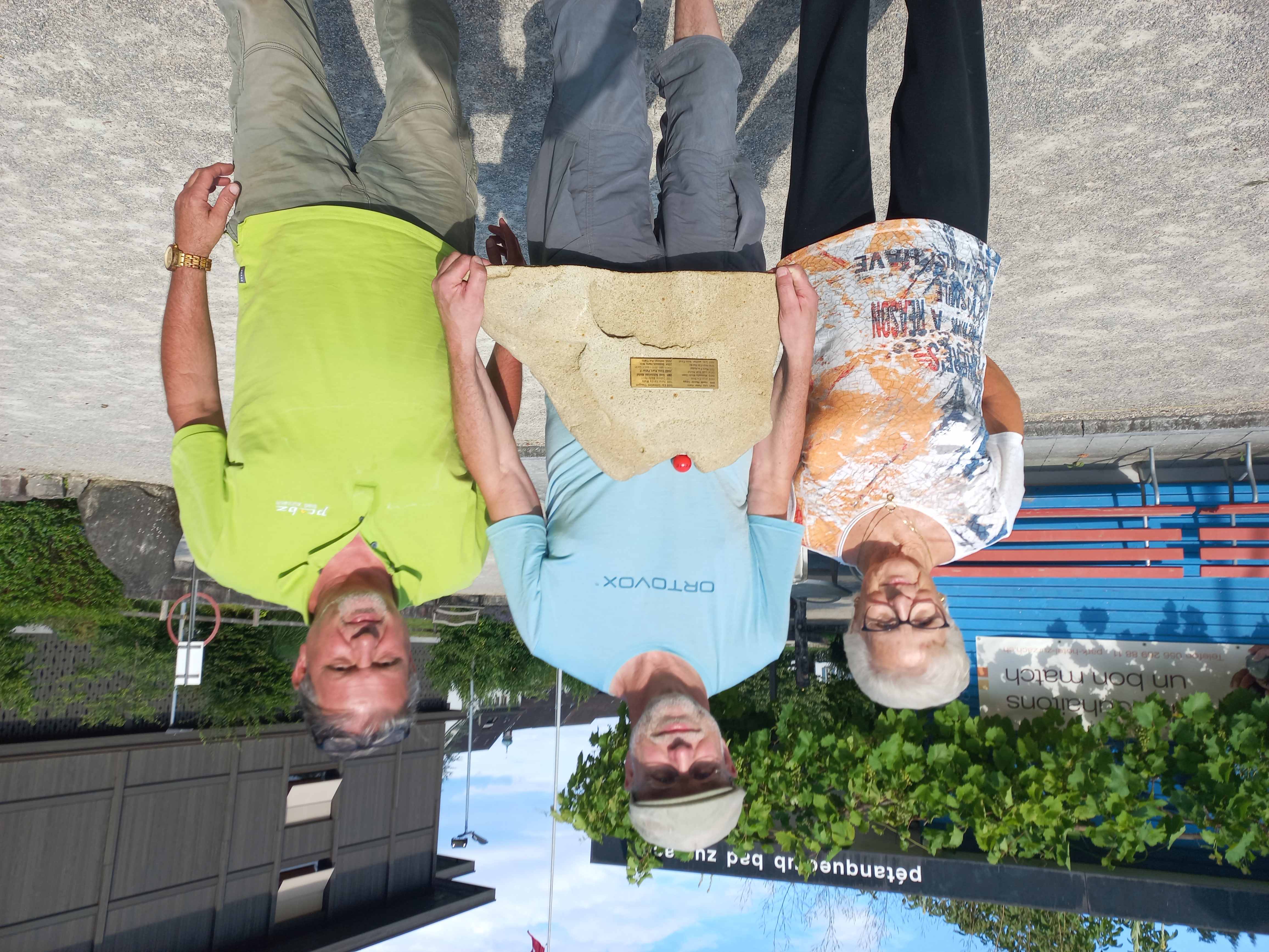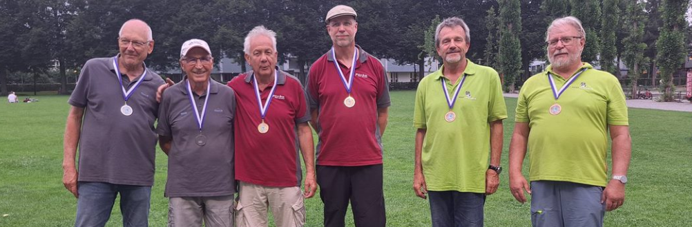 (fs) – Am Samstag, 29. Juni 2024, als die Schweizer Fussball-Nati mit dem 2:0 gegen Titelverteidiger Italien in den Euro-Viertelfinal einzog, war die Zürcher Josefwiese Austragungsort der SAP-Meisterschaft. Wie den Ranglistenauszügen zu entnehmen ist, fiel die Ausbeute unterschiedlich aus. Pascal Roth und Andy Fischer erreichten als Ex-Aequo-Fünfte gerade noch den letzten Startplatz bei den Senioren. Im Concours B figurierten Marcel Cantoni und Damir Stimac an achter sowie Urs Blöchlinger und Alfi Meier an elfter Stelle. Bei den Veteranen gelang Bernhard Zimmermann und Martin Geiser – auf dem nachfolgenden Foto in der Mitte – mit dem ersten Rang im Concours B die direkte Qualifikation. Rita Meier klassierte sich bei den Damen als gemischtes SAP im Concours B an neunter Position. Tags darauf gingen auch einige Vereinsmitglieder im Tête-à -Tête an den Start.