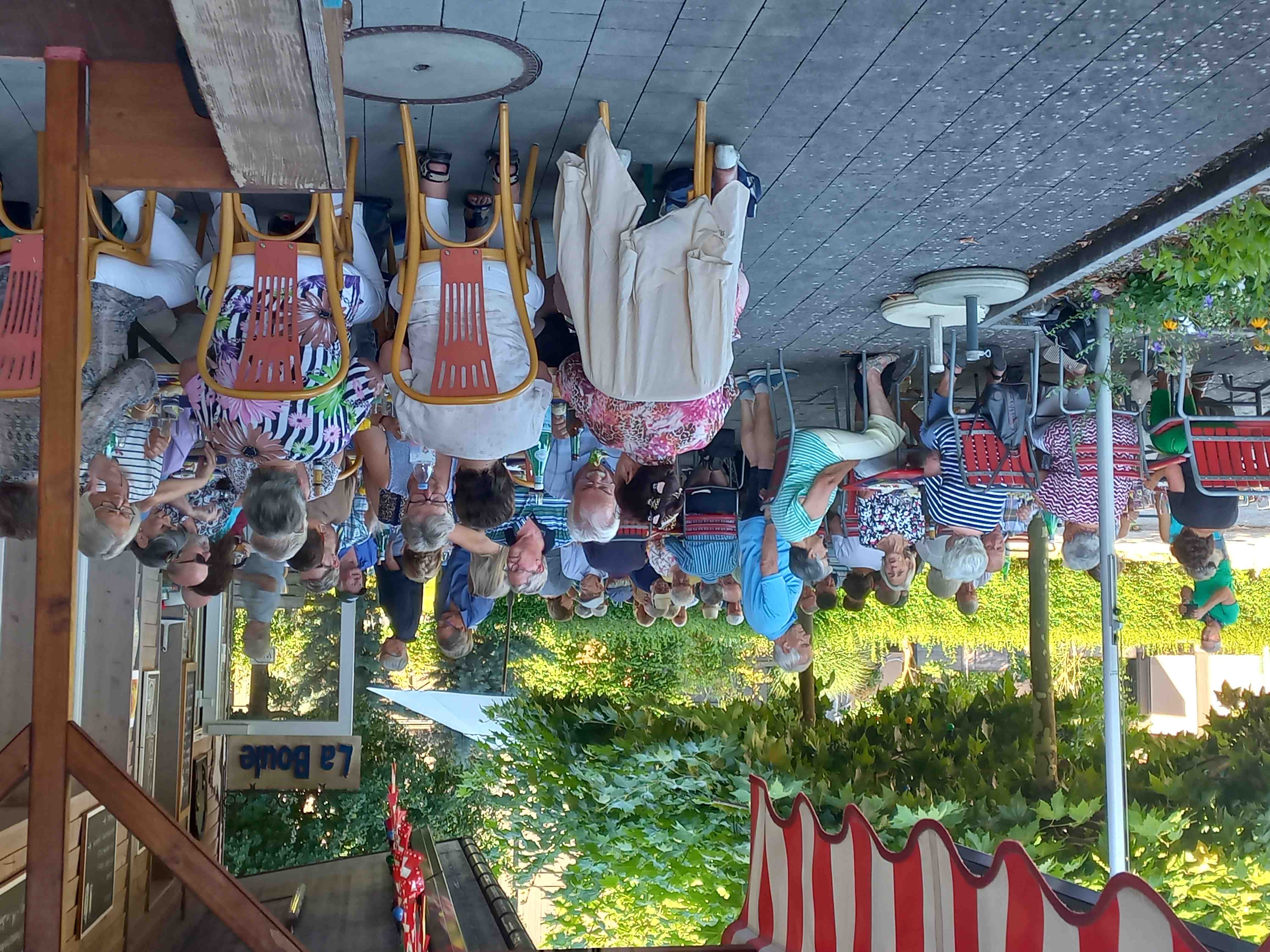 Besetzte Tische auf dem schattigen Vorplatz beim Boulodrôme