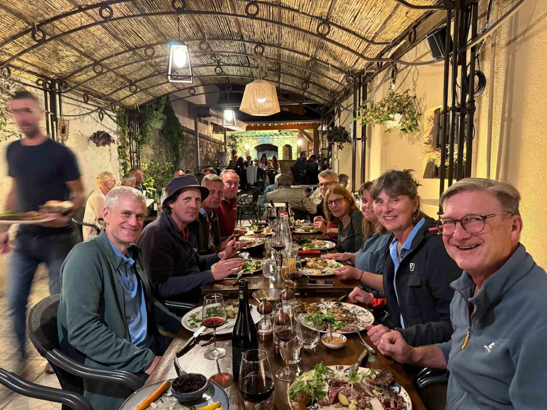Wie auf dem Foto mit dem vorbeihuschenden Kellner zu sehen ist, wurde in kulinarischer Hinsicht einiges geboten. So stand unter anderem auf der Menükarte: "Filet mignon de cochon noir à la myrte corse". Es gab eine grosse Auswahl an ausgezeichneten Adressen, welche die regionale Küche ehren und die Aromen von Land und Meer auf subtile Weise kombinieren. Die Gastfreundschaft verlieh den genussvollen Erlebnissen eine besondere Note. Das exquisite Nachtessen am vorletzten Abend ging auf Kosten der Vereinskasse, was die Teilnehmenden mit Applaus zu schätzen wussten.