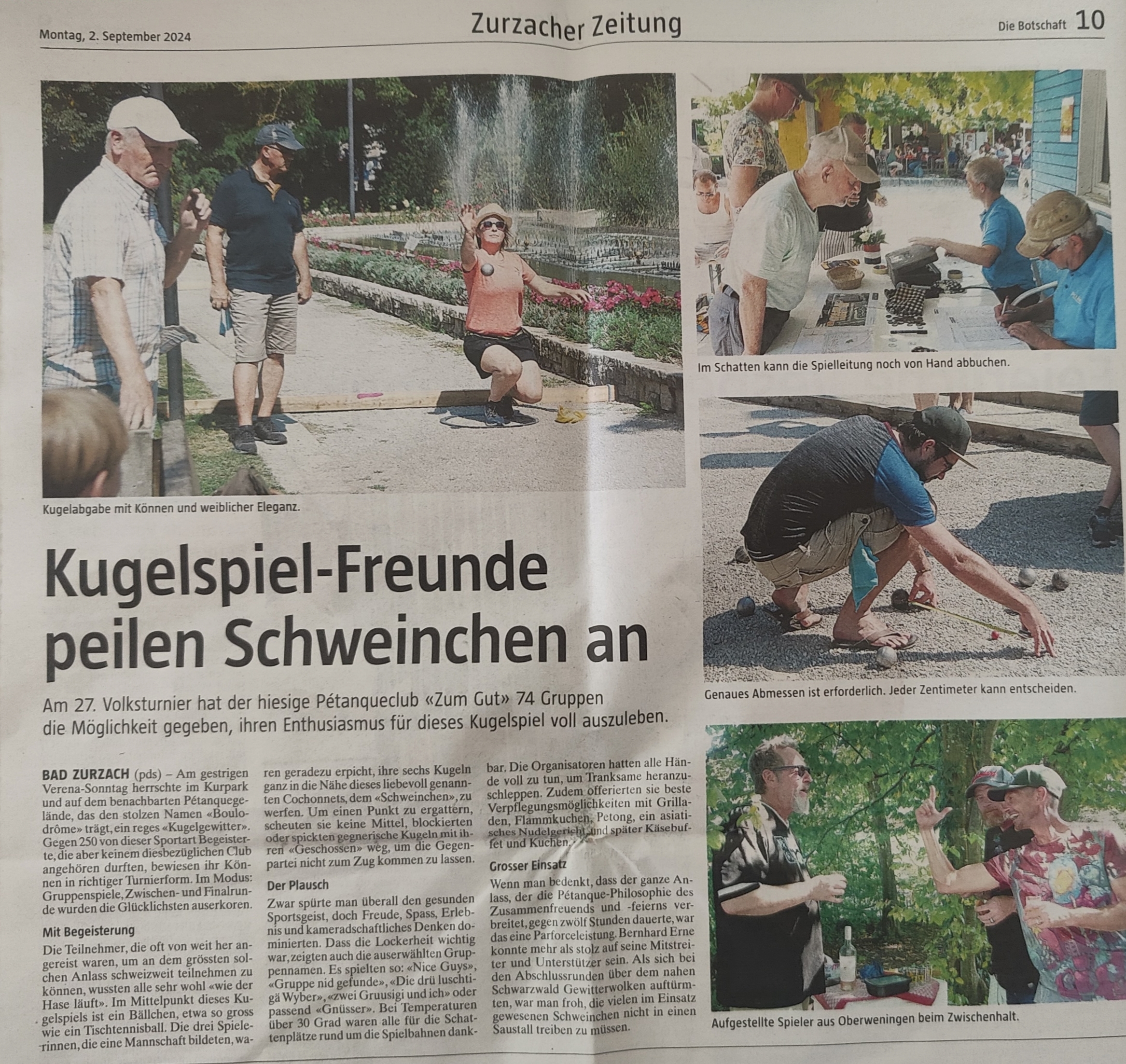 (fs) – Traditionsgemäss am ersten Sonntag im September – diesmal sogar am Verenatag – stand das Kultturnier auf dem Programm. Nachdem in den Vorjahren 59 bzw. 70 Tripletten an den Start gingen, waren es auf den hergerichteten Spielfeldern beim Boulodrôme und im Kurpark deren 74.